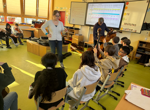 Am Mittwoch, dem 17.12.2025, waren eine Lehrerin und ein Lehrer vom Erich-Kästner-Gymnasium bei uns in der Schule. Sie erklärten und zeigten den Viertklässlern verschiedene Streichinstrumente. Am Erich-Kästner-Gymnasium kann man sich in der 5. und 6. Klasse für eine Streicher-Klasse anmelden, in der man ein Streichinstrument lernen kann. Während des Besuchs durfte jedes Kind ein Instrument selbst ausprobieren. Zum Schluss haben sie zusammen ein Lied geübt. Die Kinder waren sehr interessiert und neugierig. Alle hatten viel Spaß dabei.